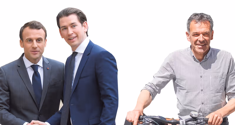 Die Person als Marke: Emmanuel Macron (l.) gründete eine Bewegung und reüssierte, Sebastian Kurz führte die nachhinkende Partei zum Wahlsieg und Georg Willi setzte sich trotz schwächelnder Partei als Bürgermeister durch. Montage: TT