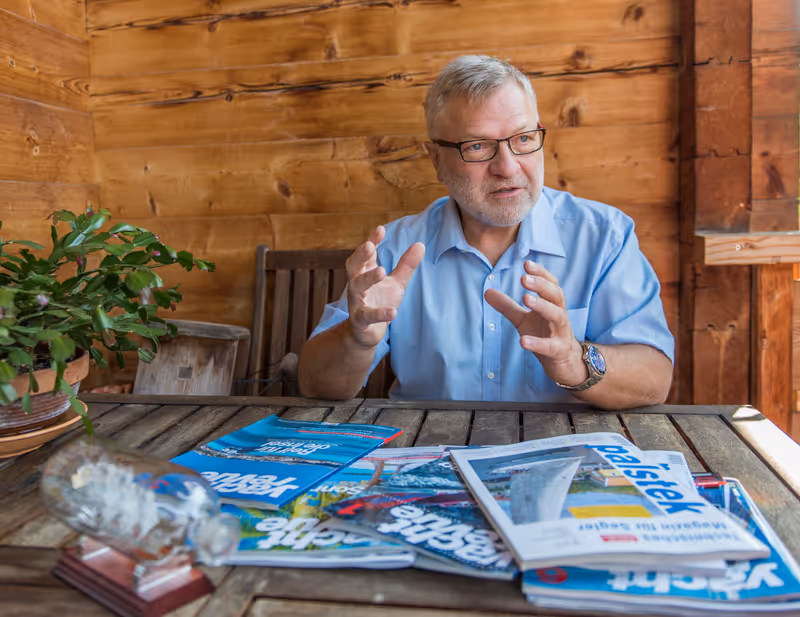 Sein „Mut zur Feigheit“ habe ihn schon ein paarmal gerettet, beim Motorradfahren, beim Skifahren und eben auch beim Segeln. „Ich bin schon ein paarmal gerade noch von der Schaufel gefallen“, sagt er und man bekommt eine Ahnung, wo der Tausendsassa die kolportierten 64 Jahre Lebenserfahrung herhat.