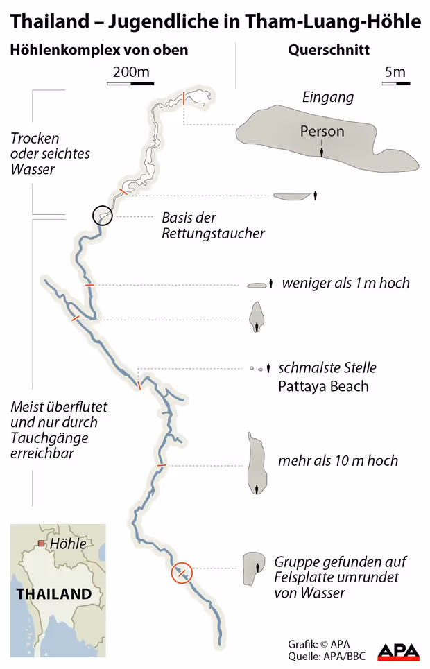 Zunächst hatten die Einsatzkräfte versucht, einen alternativen Höhlenausgang für die Rettung zu finden. Außerdem zogen sie die Möglichkeit in Betracht, dass die Rettung erst in ein paar Monaten erfolgt, wenn nach dem Ende der Monsunzeit das Wasser aus der Höhle abläuft. Der steigende Wasserspiegel und der gleichzeitig fallende Sauerstoffgehalt in der Höhle zwangen sie aber schließlich zum sofortigen Handeln. (TT.com/APA/dpa/Reuters/AFP)