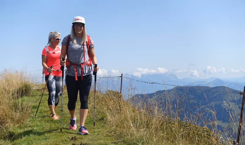 Alpbach – Am Wiedersberger Horn wuselt es an diesem heißen Sommertag nur so – und aus dieser Masse an Leuten sticht eine Dame mit bunten Sponsorenlogos am T-Shirt heraus. Eva-Maria Brem macht sich mit flotten Schritten hinter der topfitten Mama Maria zum Gipfel auf. „Ein herrlicher Tag zum Wandern“, schickt die 29-jährige Skirennläuferin aus Münster mit einem breiten Grinsen ins Alpbachtal hinunter.