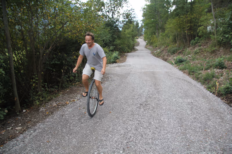 Nassereith, Tarrenz – „Lässiger Weg“: Josef Haslwanter war mit seinem Einrad unterwegs, als er gestern zur Baustellenbesichtigung stieß. Imst Tourismus hatte LHStv. Josef Geisler eingeladen, um den neuen Gurgltalradweg in Augenschein zu nehmen. Der erste Eindruck des unabhängigen – weil überraschend dazugestoßenen – Radlers fiel positiv aus.