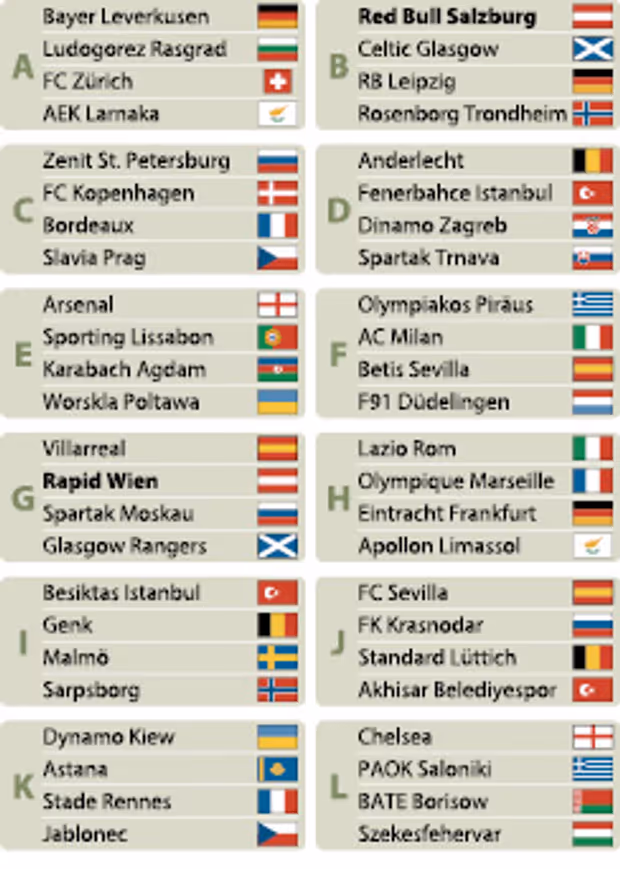 Gruppe A: Bayer Leverkusen (Baumgartlinger, Dragovic, Özcan), Ludogorez Rasgrad (BUL), FC Zürich, AEK Larnaka