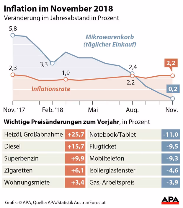 Wien – Das Leben in Österreich ist wieder etwas teurer geworden. Auch im November lag die Inflation bei 2,2 Prozent – wie schon im Monat Oktober. Die Ausgaben für Wohnung, Wasser und Energie erhöhten sich gegenüber November 2017 um durchschnittlich 2,8 Prozent und waren damit der stärkste Preistreiber. Lebensmittel verteuerten sich hingegen moderat, bei zahlreichen Produkten gab es sogar Preisrückgänge.