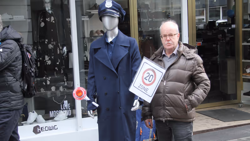 Schaufensterpuppe als Verkehrsbremse in Landecker Begegnungszone