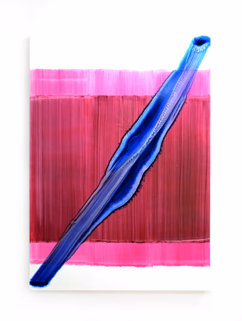 Janine Weger braucht große Sehabstände zum Malen ihrer Bilder, wofür sie sich aus „normalen“ Pinseln eigene Werkzeuge baut, die fast wie Besen daherkommen. Tief in Farbe getaucht, durchpflügt sie mit diesen vertikal die liegenden Leinwände. Bisweilen in mehreren sich überlappenden Schichten, um oben, unten oder seitlich immer Weißräume freizulassen. Die noch nassen Farbflächen durchkreuzt die Künstlerin schließlich diagonal in vehementem Gestus mit einer Kontrastfarbe. So konzentriert der erste Schritt von Wegers Tun ist, so emotional ist der zweite. Angelegt als Spiel mit dem Zufälligen, das sich aus der Überlagerung von zwei Schichten nasser Farbe ergibt, wobei der oberen Harz beigemischt ist.