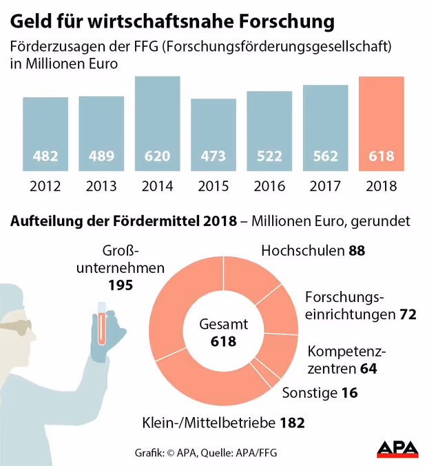 Die Förderung für Forschungsprojekte betrug im Vorjahr 618 Mio. Euro (2017: 562 Millionen Euro). 61 Prozent der Mittel (377 Millionen Euro) gingen an Unternehmen, davon 182 Millionen Euro (29 Prozent) an KMU und 195 Millionen Euro (32 Prozent) an Großunternehmen. Weiters entfielen 88 Millionen Euro (14 Prozent) an Hochschulen, 72 Millionen Euro (12 Prozent) an Forschungseinrichtungen und 64 Millionen . Euro (zehn Prozent) an Kompetenzzentren.