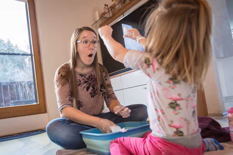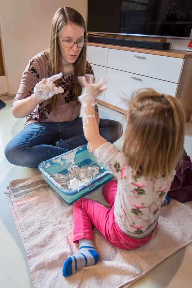 Nun sind Martina Zangerl und Matea seit mehr als einem Jahr ein eingespieltes Team. Wer die beiden an diesem Mittwochmorgen beobachtet und sieht, wie Martina der Kleinen Rasierschaum auf die Hände sprüht, sodass diese strahlt, kommt nicht umhin zu bemerken: „Da haben sich zwei gefunden." Mutter Hanna lacht und ergänzt: „Wir, die ganze Familie, und Martina haben uns gefunden."