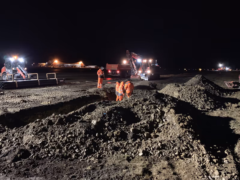 Bis zu vier Baukolonnen heben in einem ersten Schritt Kabelgräben neben der Start- und Landebahn für das Leerrohrsystem und somit für die zukünftige neue Flughafenbefeuerung aus. Parallel werden die Fundamente für die neuen Stationen der Befeuerung sowie der Notstromversorgung erstellt. Ab April folgen dann die Elektroarbeiten für die technische Ausrüstung der Flughafenbefeuerung und -steuerung.
