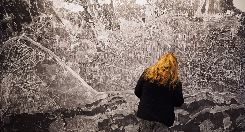 Der Blick von oben im Abstand von acht Jahren mache Geschichte auch als „Entwicklung, Beherrschung und Ordnung des Raumes“ begreifbar, erklärt Museumsleiter Matthias Breit die Idee. So zeige das Bild aus dem Jahr 1945 – mit dem die Alliierten u. a. die Treffergenauigkeit im Bombenkrieg dokumentierten – auch, „wie hochverdichtet sich das NS-System gegen Kriegsende im Raum darstellte“.