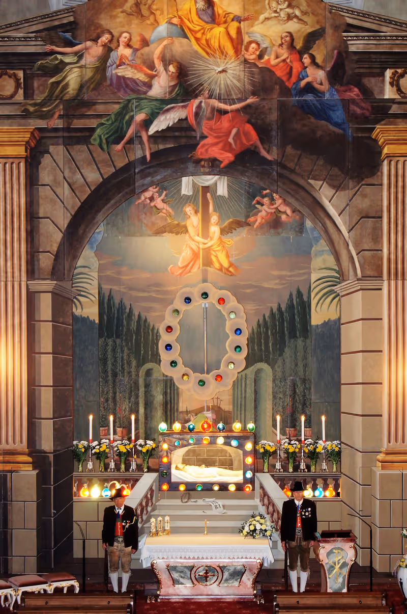 Zur Tradition gehört, dass die Feller-Schützen das Ostergrab bewachen. Heute Dienstag um 9 Uhr startet der umfangreiche Aufbau. Zwei Schützen werden dann vor dem Altar das Grab bis zur Osternachtsfeier um 21 Uhr bewachen. Als Höhepunkt wird die Auferstehung Christi von den Schützen mithilfe eines eigenen Aufzugsmechanismus dargestellt. (TT)