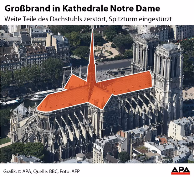 Das Feuer auf dem Dach hatte sich sehr schnell auf rund 1000 Quadratmeter ausgebreitet, wie Feuerwehrsprecher Plus erläuterte. Der Dachstuhl stand lichterloh in Flammen; über Paris bildete sich eine gigantische Rauchwolke. Der kleine Spitzturm in der Mitte des Dachs stürzte ein, die beiden Haupttürme konnten jedoch gerettet werden - die Feuerwehr hatte große Sorge um deren Standsicherheit. Plus zufolge wurde befürchtet, dass die Konstruktion geschwächt würde und die tonnenschweren Glocken von Notre-Dame abstürzen könnten.