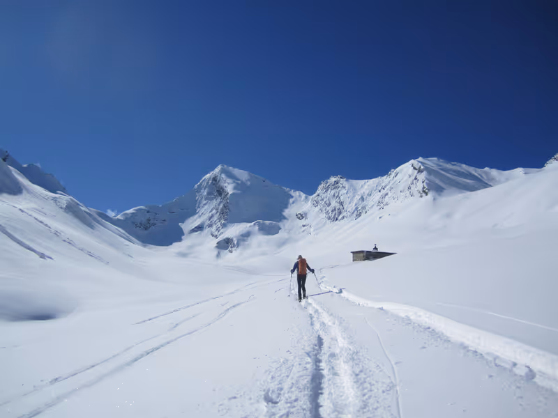 Doch zu Beginn geht es mäßig ansteigend und daher sehr gemütlich dahin und bald schon drängt sich der atemberaubende Granatenkogel ins Blickfeld. Die 3318 Meter hohe Pyramide ist ebenfalls ein Tourenziel – allerdings ein schweres –, am Dienstag zog sogar eine einzelne Person die steilen Spitzkehren hinauf. Seinen Namen hat der Granatenkogel von den in diesem Gebiet vorkommenden Mineralien der Granate. Und, ebenfalls interessant: Die Grenze zwischen Österreich und Italien geht genau über den Berg.