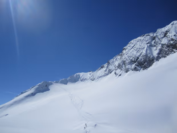 Nun geht es einen kurzen Rutscher hinab auf den Granatenferner, der spaltenarm ist – wir waren ohne Seil unterwegs. Weniger rau zeigt sich hier übrigens der Granatenkogel, an dessen Rückseite wir nun mäßig ansteigend weiterziehen. Die Essenerspitze sieht man ebenfalls: inmitten vieler gewaltiger Dreitausender wie etwa dem dahinterliegenden Hochfirst (3405 Meter) nimmt sich die 3200 Meter hohe Erhebung aber sehr bescheiden aus. Kurz vor dem Skidepot muss dann noch einmal ein steiler Nordosthang bewältigt werden, hier ist gute Spitzkehrentechnik das Um und Auf. Der Aufstieg ist zum Glück nicht sehr lang und daher wenig kräfteraubend.