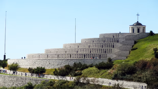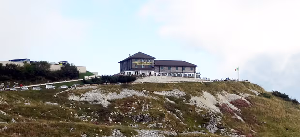 Wahrscheinlich noch spektakulärer für die unzähligen Paragleit-Piloten, die zu Hunderten hoch über dem Monte Grappa den tiefblauen Himmel in ein buntes Farbenmeer verwandeln. Aus Pietätsgründen ist die Zufahrt bis zum höchsten Punkt, auf dem sich auch das „Sacrario del Monte Grappa“ befindet, nicht erlaubt. Zu Fuß aber ist die riesige Gedenkstätte, die an ca. 20.000 während des Ersten Weltkrieges gefallene italienische und österreichische Soldaten erinnert, in gut zehn Minuten einfach erreichbar und definitiv einen kleinen Spaziergang wert. Im Ersten Weltkrieg war der Monte Grappa nämlich die letzte Verteidigungslinie der italienischen Armme gegenüber der österreichisch-ungarischen. Tausende Soldaten fanden an den Berghängen des Monte Grappa den Tod. Das Denkmal wurde nach dem Krieg, im Jahre 1930, von der damaligen faschistischen Regierung Italiens errichtet.