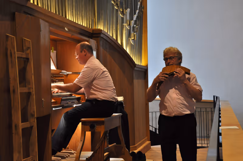 Beide haben Pfeifen: Georg Masanz an der Orgel und Jörg Frey an der Panflöte begeisterten das Publikum in Ötztal-Bahnhof.