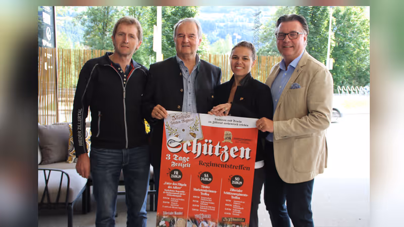 Kaltenbach, Ried –Über 170 Mitglieder zählt die Schützenkompanie RiedKaltenbach, die seit zwei Jahren am Ablauf des großen Regimentstreffens vom 23. bis 25. August tüftelt. „Es soll ein besonderes Erlebnis werden“, sagte gestern Regimentskommandant Major Herbert Empl bei einer Pressekonferenz. Drei Bataillone mit 15 Kompanien umfasst derzeit das Zillertaler Schützenregiment mit rund 1400 Mann. Gegründet wurde es im Jahre 1908. „Das war im Schützenwesen etwas Besonderes“, betont Empl. „Das Regimentstreffen, das alle drei Jahre veranstaltet wird, ist für uns eine echte Herausforderung“, unterstreicht Obmann Georg Hanser.