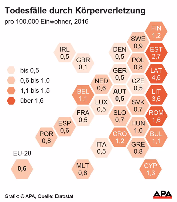 Mit 0,5 Fällen pro 100.000 Einwohner lag Österreich laut Eurostat gemeinsam mit Luxemburg, Dänemark, Deutschland, Frankreich, Tschechien, Italien und Irland unter dem EU-weiten Durchschnitt von 0,6 und belegte unter den EU-Mitgliedsländern Platz zwei. Nur in Großbritannien war demnach die Anzahl der Todesfälle durch Körperverletzung geringer und lag bei 0,1 Fällen.