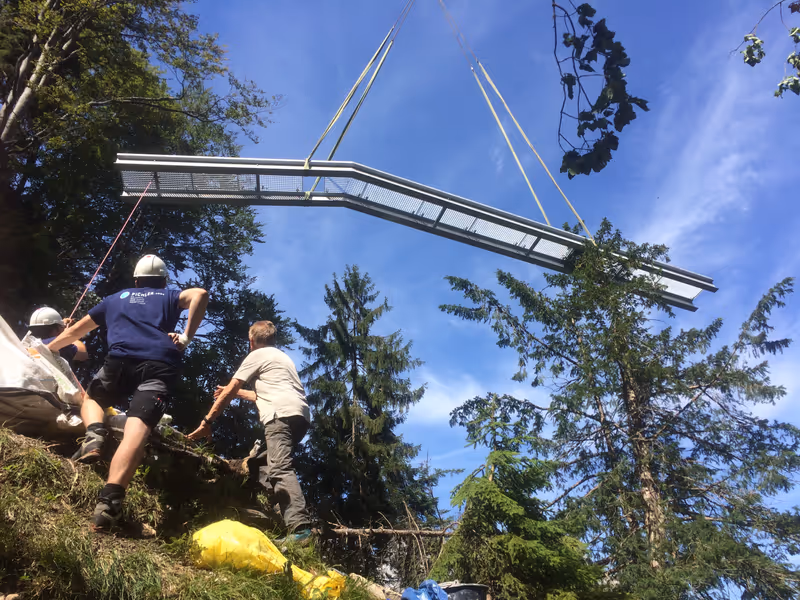 Das schwere Unwetter Ende Juli bedeutete einen herben Rückschlag für die Arbeiten, die bereits geplante Eröffnung des Steiges musste verschoben werden. Das Kaisertal war auf der Fahrstraße nicht erreichbar und auch am Bettlersteig gab es neuerlich Schäden. Anfang August konnte die 950 kg schwere Stahlbrücke eingeflogen und verankert werden.