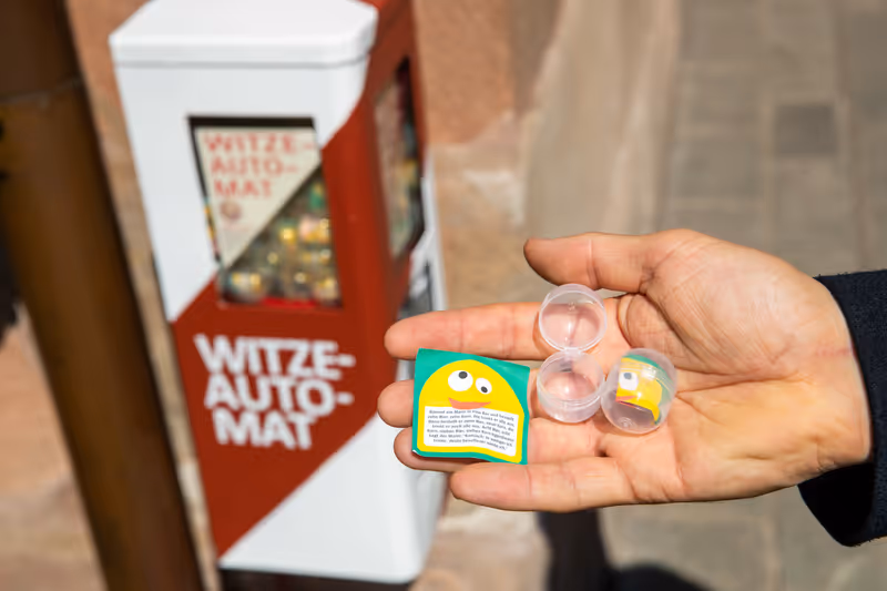 In dem umgebauten Kaugummiautomaten befinden sich Kapseln, die mit kleinen Zetteln mit je einem Witz bestückt sind.
