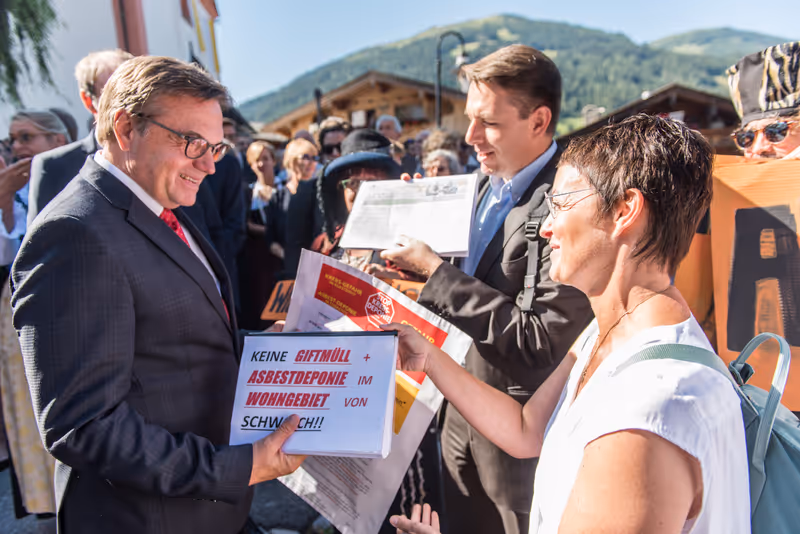 „Es war eine sehr gute Veranstaltung für uns“, sagt Richard Holzer von der Bürgerinitiative Schwoich. „Wir hatten ein sehr konstruktives Gespräch mit Landeshauptmann Günther Platter und überreichten ihm gemeinsam knapp 5000 Unterschriften gegen Giftmülldeponien in Wohngebieten in Schwoich und Kufstein“, so Holzer gegenüber der Tiroler Tageszeitung. (TT)