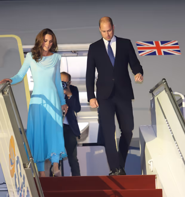 Am Montagabend empfingen mehrere Minister, Diplomaten und Regierungsbeamte das Paar auf dem Luftwaffenstützpunkt Nur Khan. Bei der Ankunft trug Kate ein knöchellanges hellblaues Kleid mit Wasserfallkragen und langen Ärmeln, kombiniert mit einer hellblauen Hose und hautfarbenen Pumps. Ihr Mann Prinz William entschied sich für einen schlichten dunklen Anzug mit dunkelblauer Krawatte. Mehr als tausend Soldaten und Polizisten waren in einer hochgesicherten roten Zone in der Hauptstadt Islamabad im Einsatz, wo das Paar nach dessen Ankunft in der Nacht auf Dienstag untergebracht war.