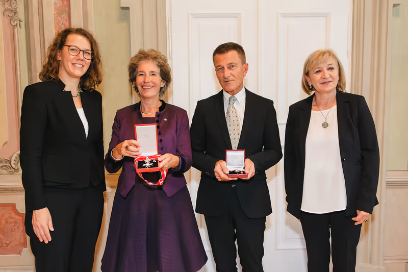 Innsbruck –Im würdigen Ambiente des Parissaals im Alten Landhaus in Innsbruck wurden am Dienstag – am historischen Gründungstag der Innsbrucker Universität – zwei Mitglieder des Rektoratsteams der Medizinischen Universität Innsbruck mit hohen Ehrenzeichen ausgezeichnet. Aus den Händen der Bundesministerin für Bildung, Wissenschaft und Forschung, Iris Rauskala, erhielt Christine Bandtlow das „Große Silberne Ehrenzeichen für Verdienste um die Republik Österreich“. Peter Loidl wurde mit dem „Österreichischen Ehrenkreuz für Wissenschaft und Kunst I. Klasse“ ausgezeichnet.