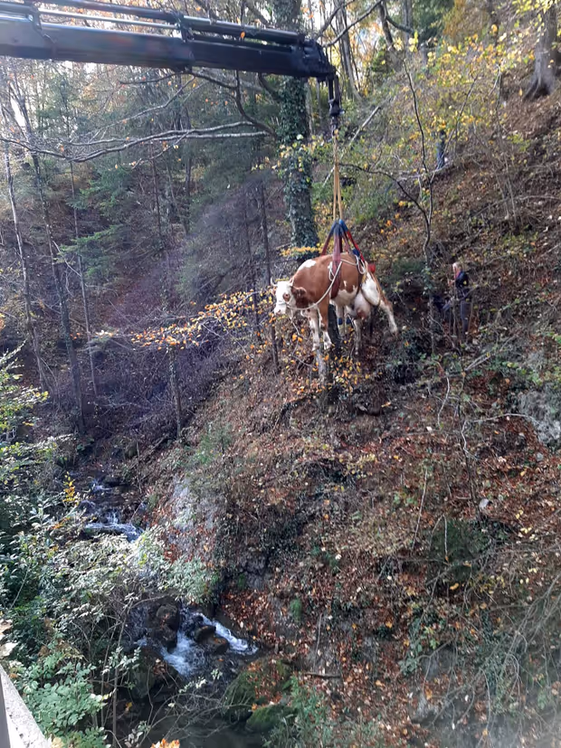 Nachdem die Kuh „Alma“ ein Junges zur Welt gebracht hatte, büxte die frischgebackene Mutter aus und verlief sich im steilen Gelände. Die Feuerwehr musste die Kuh aus ihrer Lage befreien.