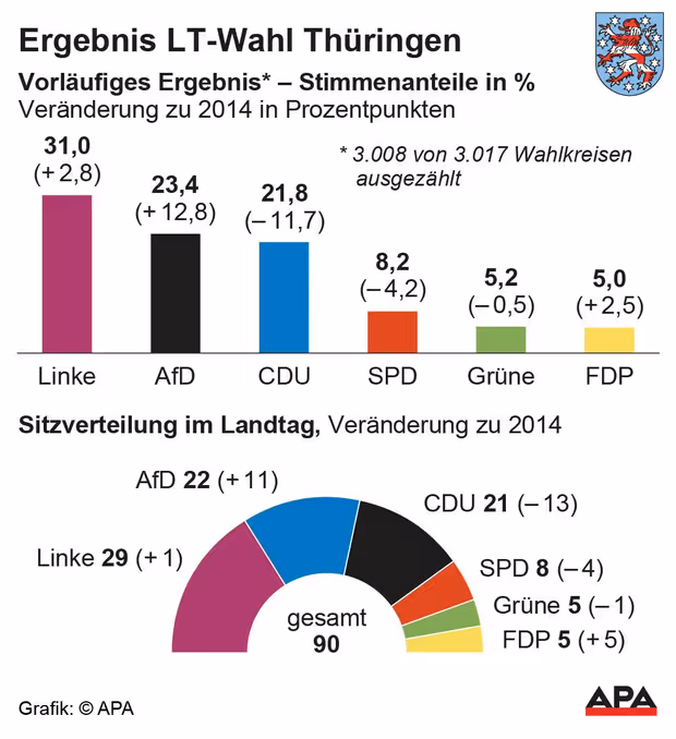 Unter dem Wortführer des rechtsnationalen Flügels der AfD wurde ihr Resultat von 2014 mehr als verdoppelt. Die CDU um ihren Spitzenkandidaten Mike Mohring, die zuvor seit 1990 stets die meisten Stimmen bekommen hatte, stürzte auf ihr schlechtestes Ergebnis. Sie lag mit 21,8 Prozent hinter der AfD auf Platz drei, wie die Landeswahlleitung mitteilte.