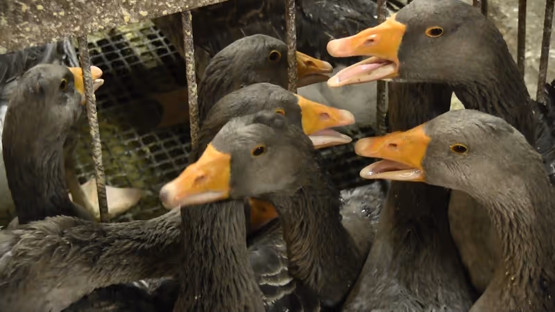 Die Gänse werden während der Stopfzeit auf engstem Raum in einem Käfig gehalten.
