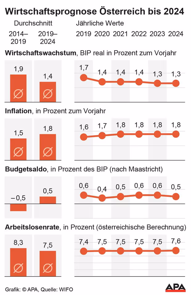 Wien – Das Wirtschaftsforschungsinstitut (Wifo) erwartet für die kommenden fünf Jahre (2020-24) ein etwas schwächeres Wirtschaftswachstum - weniger als zuletzt prognostiziert und auch weniger als im Zeitraum 2014-19. Weil auch Österreich die weltweite Konjunkturabkühlung zu spüren bekommt, wird sich das Wachstum im Schnitt auf 1,4 Prozent pro Jahr abbremsen, bis 2019 waren es im Schnitt 1,9 Prozent.