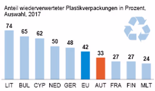 Spitzenreiter ist Litauen mit einer Recycling-Quote von 74 Prozent, dahinter folgen Bulgarien (65 Prozent), Zypern (62 Prozent), Slowenien (60 Prozent), Tschechien (59 Prozent), die Slowakei (52 Prozent) und die Niederlande (50 Prozent). Österreich liegt gemeinsam mit Luxemburg EU-weit an 22. Stelle. Weniger Kunststoff-Verpackungsabfälle werden nur in Ungarn (32 Prozent), Irland (31 Prozent), Estland, Finnland und Frankreich (je 27 Prozent) und Malta (24 Prozent) verwertet.