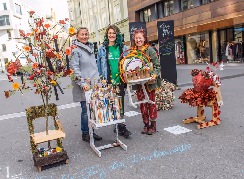 Um Kinderrechte drehte sich gestern Nachmittag auch alles am Innsbrucker Sparkassenplatz. Anlässlich des „Tages der Kinderrechte" am 20. November haben Schülerinnen der Tiroler Fachberufsschule für Garten, Raum und Mode in Zusammenarbeit mit SOS-Kinderdorf 30 Kinderstühle dekoriert. Diese stehen für 30 Jahre Kinderrechte in Österreich. Die Stühle werden in den kommenden Tagen diverse Geschäfte in der Innenstadt schmücken. (np, vg)