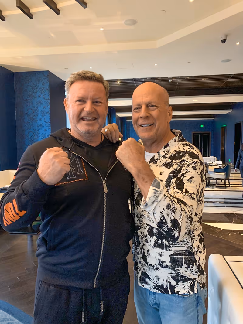 Harte Fäuste für ein Halleluja und Umsätze in China: Christian Jäger (links) traf sich in Shanghai auch mit Hollywood-Star Bruce Willis.