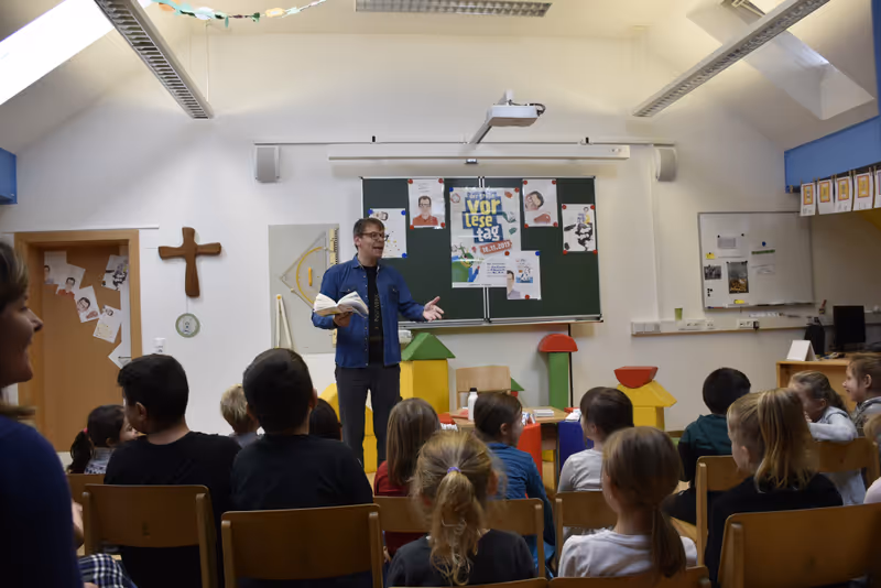 Nassereith, Mötz, Stams –Damit Kinder Freude am Lesen entwickeln, bedarf es einiger Motivation. Eine davon ist der tirolweite Vorlesetag. Auch in Nassereith wurde der gestern begangen – mit der Besonderheit, dass der eingeladene Autor Markus Köhle der jüngere Bruder des Volksschuldirektors Thomas Köhle ist. „Und der ist selber vor 37 Jahren in diese Schule gegangen“, erklärte Thomas Köhle den Schülern der ersten und zweiten Klasse.