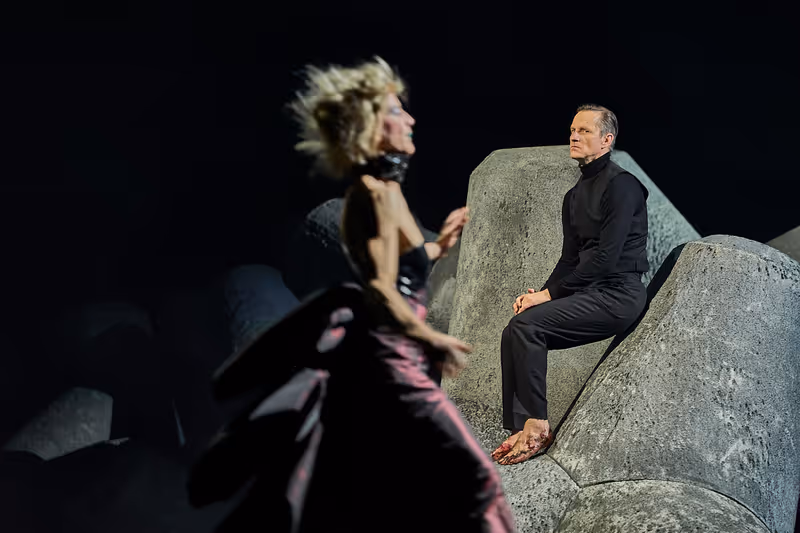 Wien – Wellenbrecher, Panzersperren, allemal wuchtige Betondinger liegen zuhauf auf der Bühne des Burgtheaters. Düster, grau, nebelig, Dunkel-Deutschland, und da blitzt es grausig rot, wie nur (Theater-)Blut zu leuchten vermag. Thusnelda, die Cheruskerfürstin, tut sich gütlich an glibberigem Fleisch, füttert den römischen Gesandten Ventidius mit der Auerochs-Jagdbeute, die dieser soeben heldenhaft gemacht hat. Hermann, der Fürst und Gatte, schmiedet da schon seine Ränke, spannt Frau wie Kinder wie Gefolge ein in sein Intrigenspiel mit dem Ziel, Germanien, ja, „(wieder) groß zu machen“.