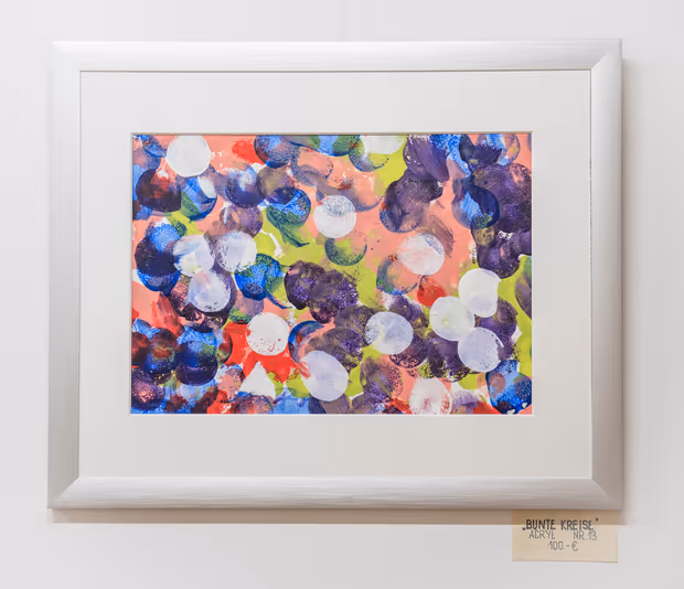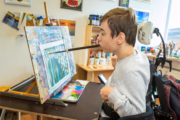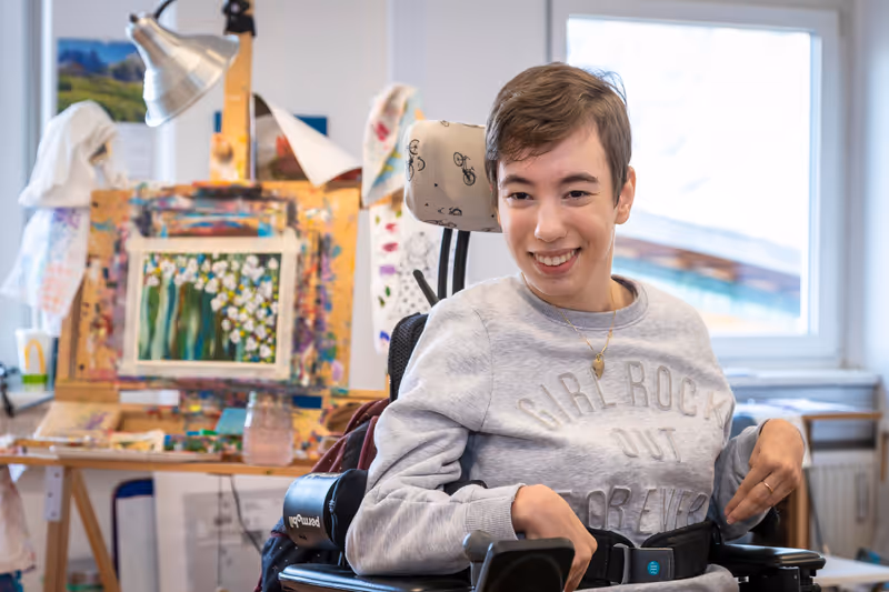 Das Malen hat Lea schon lange fasziniert, zu Beginn begann sie mit den Fingern zu malen, später mit einem Helm. Für Lea die beste Hilfskonstruktion zu finden, war ein langer Prozess. Letztendlich wurde es eine abnehmbare Spange, an der die Pinsel befestigt werden. „Ich muss fühlen, was ich male und so spüre ich den Druck des Pinsels am besten", zeigt sich die Künstlerin zufrieden.