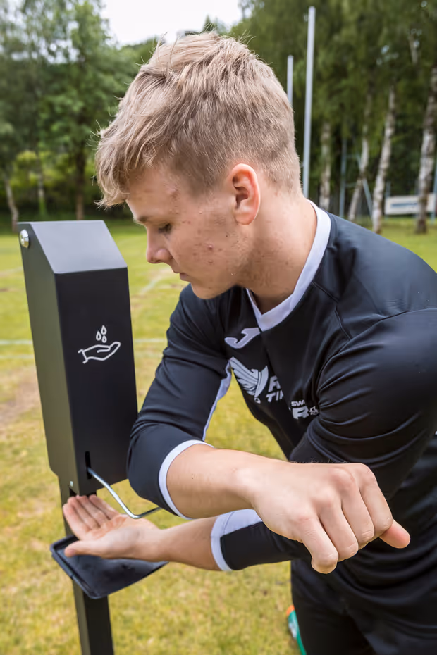 Je später die Uhrzeit, desto älter werden die Footballer. Gegen 18 Uhr trudelt Coach Herron ein. Gut gelaunt werden zuerst einmal die Hände am Eingang desinfiziert. Einige seiner Akteure sind bereits umgezogen. Auf einmal tauchen zwei Herren mit Masken, Handschuhen und einem kleinen Koffer über der Schulter auf. „Dopingtests stehen auf dem Programm“, erklärt Coach Herron. Grein ergänzt mit einem Augenzwinkern: „Wir haben uns was einfallen lassen, wenn die Zeitung kommt.“