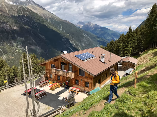 Die Einkehr hat ihren Namen übrigens von dem stufenförmigen Gelände, das sich dahinter hinaufzieht (Bank, Bänkenalm) und das Gelände ringsherum gehört Hubertus Pfurtscheller. Vor vielen Jahren gab es hier viel Almvieh, dann wurde das Vieh weniger und das Gelände wuchs zu. Darüber freut sich ein Adlerpaar – „das nistet gleich oberhalb des Hauses“ erzählt Fee. Fee und Hubertus bewirten ihre Gäste mit kleinen Gerichten und gutem Kuchen, und von der Terrasse aus hat man einen tollen Blick auf die Umgebung. Man sieht etwa die Falbesoner Ochsenalm auf der anderen Talseite und sogar die Nürnberger Hütte (aber nur, wenn man weiß, wo man zu suchen hat).