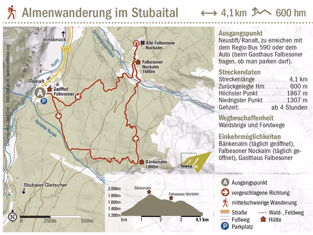 So kommt man hin: Im Stubaital steuert man Neustift an, dort bis nach Ranalt fahren und bei Hans Winkler/Gasthaus Falbesoner fragen, ob man vor seinem Haus parken kann (Ranalt ist auch erreichbar mit dem Regiobus 590). Gleich neben den Häusern (bei einem grauen Container) führt ein Steig in den Wald hinauf (Wegweiser). Wir haben am vergangenen Samstag die Runde mit der Bänkenalm als erstes Ziel gestartet, man kann von hier aus die Runde aber auch umgekehrt (über die Nockalm) starten. Bei einer Wegteilung also rechts hinauf in ein idyllisches Waldstück und gleich steil bergauf.