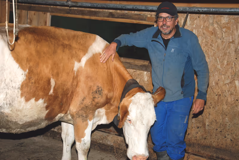 Kaum eine halbe Stunde später stapft er in blauer Arbeitskleidung und Stiefeln durch steile, felsdurchsetzte Weideflächen. Ausgerüstet mit Taschenlampe und Hirtenstock treibt er 39 Kühe zum Melkstand. Manchmal müssen die Rindviecher mit lauten Zurufen aus entlegenen Ecken geholt werden: „Geahsch iatz obi, tua weiter.“