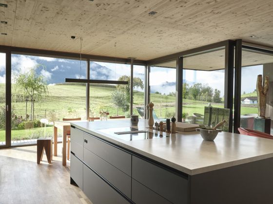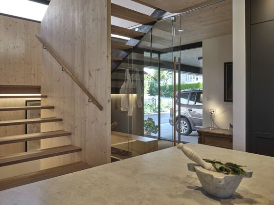 Das betonierte Kellergeschoß mit Lager-, Technik- und Werkstattflächen ist für beide Familien auch extern vom Carportbereich aus zugängig. Der Wunsch nach einem nachhaltigen und ökologisch wertvollen Holzbau stand von Beginn an bei Bauherren und Architekten an erster Stelle und so sorgen Holzoberflächen an der Fassade und in den Innenräumen heute für viel Wärme und Wohlbehagen. „Mir war es sehr wichtig, dass sich das Gebäude mit seiner dunklen Holzfassade gut in die herrliche Naturlandschaft einfügt und die schöne Sicht auf die dahinterliegende, helle Kirche nicht zu sehr stört. Auch die Transparenz innerhalb der Häuser und hinaus in die Natur war uns als Architekten ein großes Anliegen“, so Architekt Christoph Zelger.
