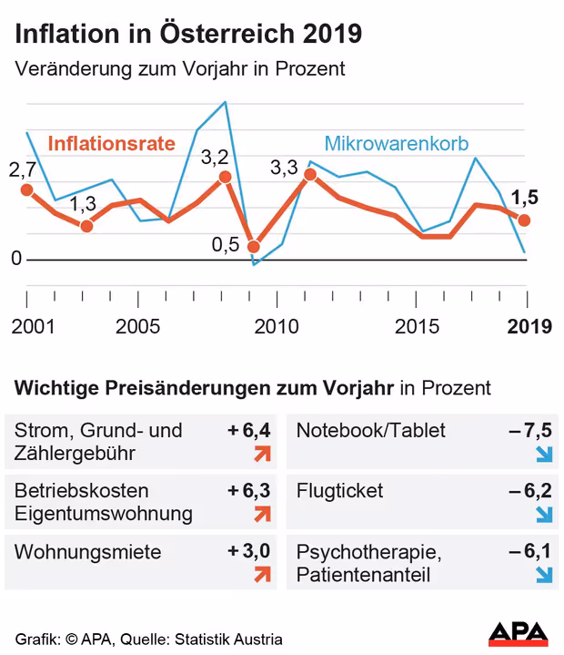 Die Teuerung des Jahres 2019 ist mit 1,5 Prozent deutlich geringer ausgefallen als im Jahr 2018 mit 2,0 Prozent und 2017 mit 2,1 Prozent. Sie lag aber über den Werten von 2016 und 2015 (jeweils 0,9 Prozent). 2019 stiegen die Mieten um 3,0 Prozent und damit doppelt so stark wie die allgemeine Inflationsrate (VPI). Nahrungsmittel wurden um 1,1 Prozent teurer.