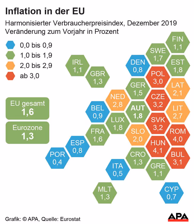 Die Inflation im Euroraum hat vor der Jahreswende angezogen. Die Verbraucherpreise legten im Dezember um 1,3 Prozent im Vergleich zum Vorjahresmonat zu, wie das Statistikamt Eurostat am Freitag mitteilte. Damit wurde eine Schnellschätzung bestätigt. Im November lag die Teuerung lediglich bei 1,0 Prozent. In Österreich lag die harmonisierte Inflation (HVPI) im Dezember bei 1,8 Prozent.