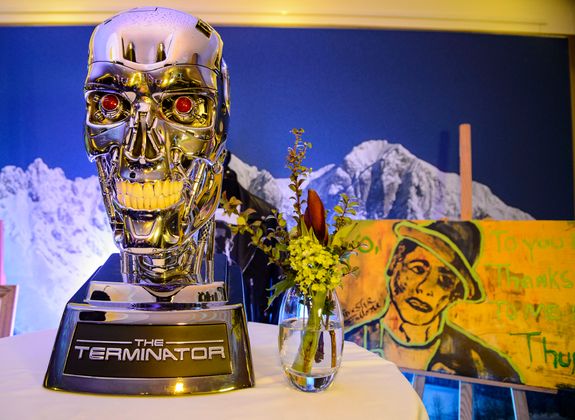 Schnäppchen fand sich am Donnerstag kaum eines, höchstens Arnies Governor-Jacke aus der Zeit seiner politischen Tätigkeit (Rufpreis 1000 Euro). Im Mittelpunkt des Interesses stand ein Besuch am Film-Set (20.000 Euro) von Arnie. René Benko könnte sich höchstens das vorstellen, „denn ein Schauspieler wäre ich nie“. Das gemeinsame Workout mit Schwarzenegger im Fitnesscenter? Schlanke 10.000 Euro stellten das Eröffnungsgebot dar. „Das wäre vielleicht was für mich“, meinte Lindsey Vonn. Und da war noch der Terminator-Kopf (20.000 Euro), einer der Auktions-Höhepunkte. Gerne fotografiert – aber fände er auch in einem der Promi-Häuser Platz außer im Keller?