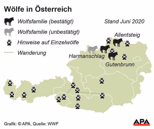 Zu dem schon länger bestätigten Wolfsrudel beim Truppenübungsplatz Allentsteig kamen ebenfalls im Waldviertel welche in Harmanschlag und Gutenbrunn hinzu. Außerdem wird in Vorderweißenbach in Oberösterreich ein weiteres Rudel vermutet. Die Zahl von derzeit 30 bis 35 Wölfen "wird natürlich in Zukunft steigen", sagte WWF-Wolfsexperte Christian Pichler. Wir seien von Wölfen "umzingelt", in Deutschland gebe es beispielsweise 400 bis 500 Individuen und in Italien 1000 bis 2000.