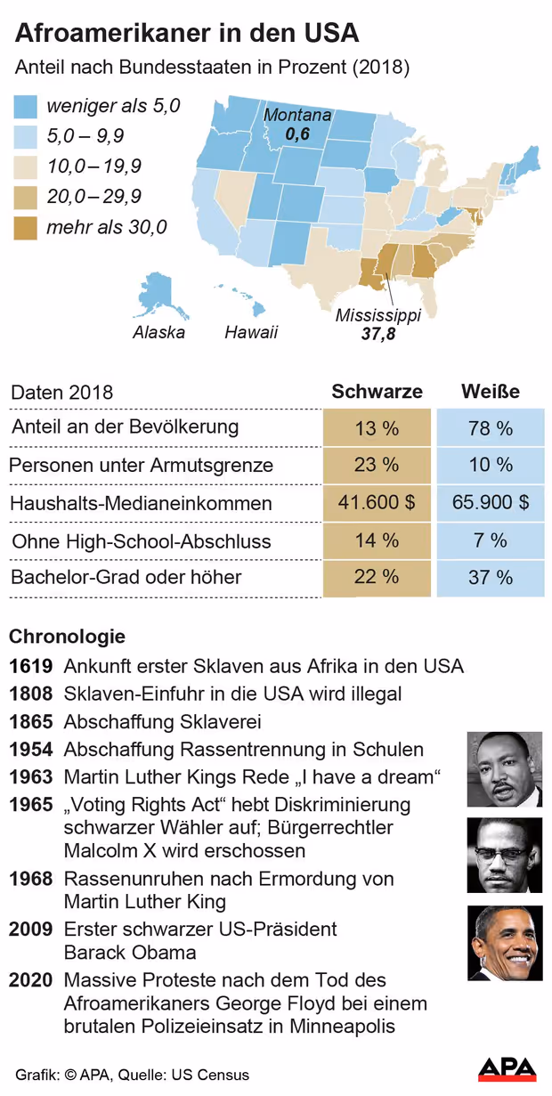 Die meisten Afroamerikaner leben nach wie vor hauptsächlich in den südlichen US-Staaten. Insgesamt beträgt ihr Anteil an der US-Bevölkerung laut der für US-Bevölkerungsstatistiken zuständige Behörde (Census Bureau) 13,4 Prozent. Rund ein Viertel der Afroamerikaner leben unter der Armutsgrenze (Weiße: zehn Prozent) und ihr Haushalts-Medianeinkommen liegt mehr als 20.000 Dollar unter jenem der weißen Bevölkerung. Auch in Sachen Bildung zeigen die Zahlen ebenfalls eine Kluft: 13,5 Prozent der Afroamerikaner haben keinen High-School-Abschluss, nur 22 Prozent absolvieren einen Bachelor oder eine höhere Ausbildung. (Die zuletzt erhältlichen Zahlen stammen aus 2018) (APA)