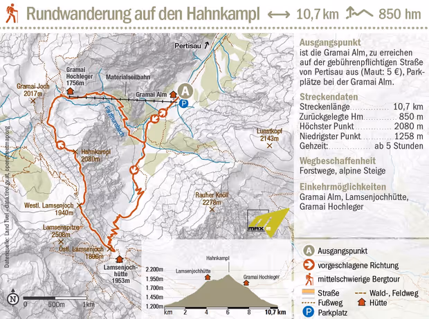 „Im Vorjahr hat der Hochleger Strom und Abwasserkanal bekommen“, erzählt Adi Rieser. Das ist jetzt allerdings der Grund, warum der Abstieg vom Gramai-Hochleger auf den ersten Metern ein wenig mühseliger ist. Der Weg, der für die Hüttenarbeiten verbreitert wurde, präsentiert sich nämlich im ersten Abschnitt steil und rutschig. „Noch heuer soll der Weg wieder zum Steig zurückgebaut werden“, kann Rieser jedoch Positives berichten. Sein Tipp: Wer sich dieses kurze Steilstück im Abstieg ersparen will, sollte die Rundwanderung zum Hahnkampl in umgekehrter Richtung machen – schöner ist es allerdings, wenn man wie beschrieben startet.