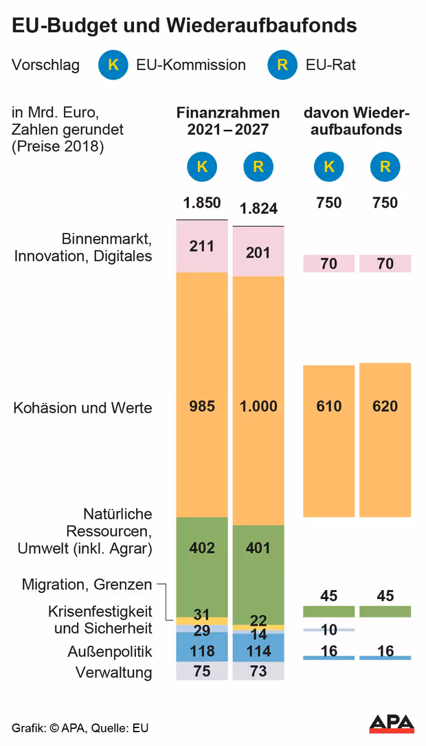 ➤ VOLUMEN: Für den nächsten EU-Finanzrahmen von 2021 bis 2027 schlägt EU-Ratspräsident Charles Michel als Gipfelorganisator ein Volumen von 1074,3 Milliarden Euro vor. Dies sind 20,5 Milliarden Euro weniger als im laufenden Sieben-Jahres-Budget. Hinzu kommt aber der Corona-Wiederaufbaufonds, dessen Gelder den Haushalt aufstocken.