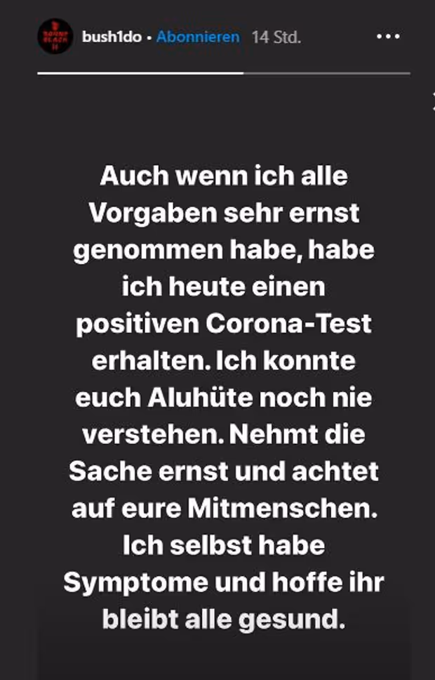 Bushido hatte am Dienstagabend seine Infektion öffentlich gemacht. „Auch wenn ich alle Vorgaben sehr ernst genommen habe, habe ich heute einen positiven Corona-Test erhalten“, schrieb der 42-Jährige in einer Instagram-Story auf seinem Account. Er habe Symptome. „Nehmt die Sache ernst und achtet auf eure Mitmenschen“, so der Rapper.