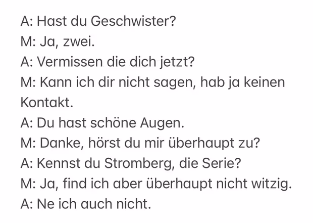 - „Meine Tante hat mich hier angemeldet, weil ich nie eine Frau an mich ranlasse." – (Pick-Up-Artist-Lehrbuch, Lektion 1; und überhaupt: Wer so eine Tante hat, braucht keine Feinde mehr)